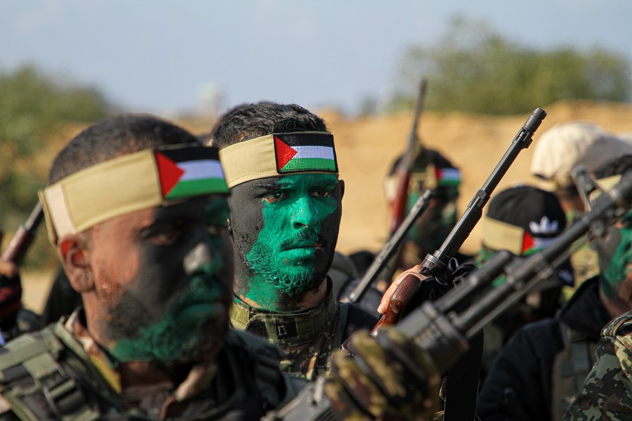 Palestinian militants take part in a military maneuver in the southern Gaza Strip city of Rafah, on Dec. 29, 2021. (Photo: Xinhua)