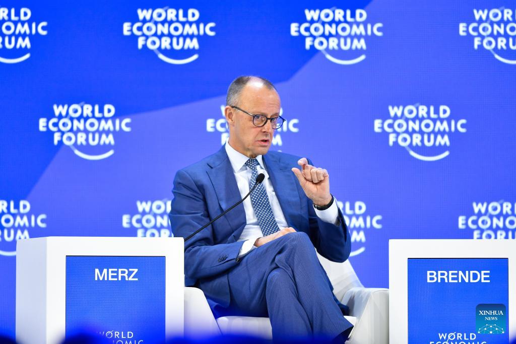 German Chancellor Friedrich Merz (L) speaks at the World Economic Forum (WEF) Annual Meeting 2026 in Davos, Switzerland, Jan. 22, 2026. (Xinhua/Lian Yi)