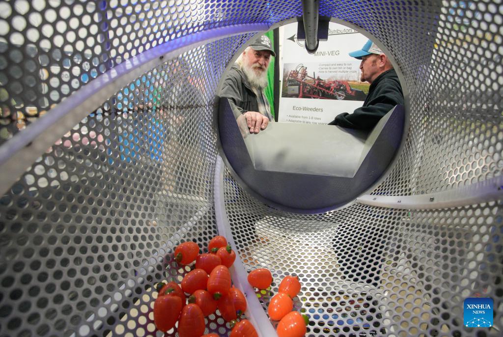 People view a fresh fruit washing machine at the 2026 Pacific Agriculture Show in Abbotsford, British Columbia, Canada, Jan. 22, 2026. The event kicked off here on Thursday and runs until Jan. 24. (Photo by Liang Sen/Xinhua)