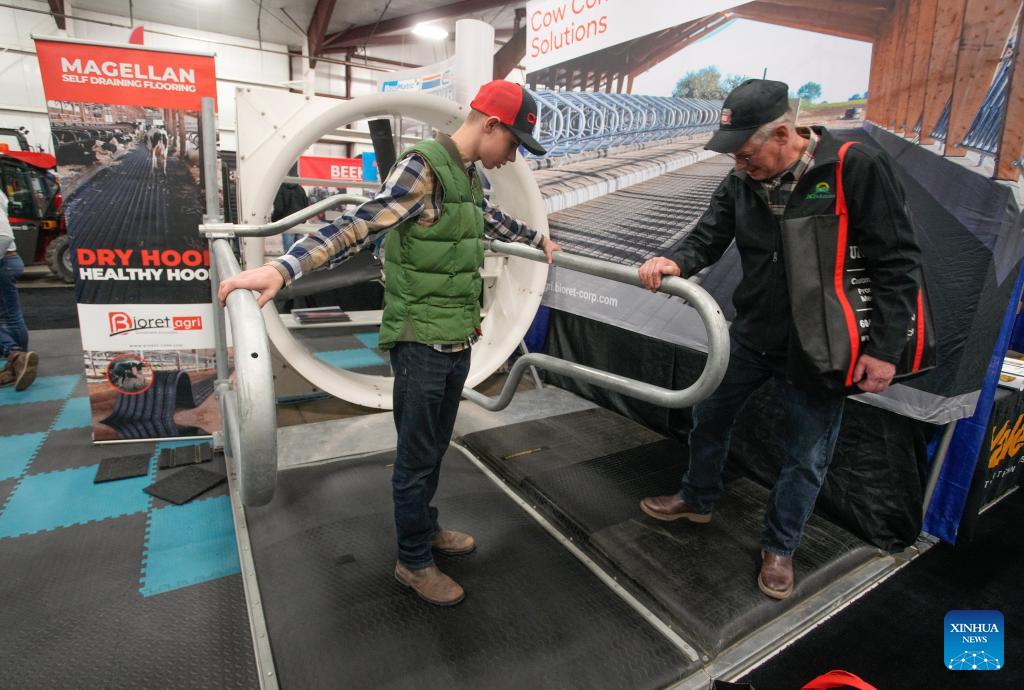 People learn about cows and dairy farming equipment at the 2026 Pacific Agriculture Show in Abbotsford, British Columbia, Canada, Jan. 22, 2026. The event kicked off here on Thursday and runs until Jan. 24. (Photo by Liang Sen/Xinhua)