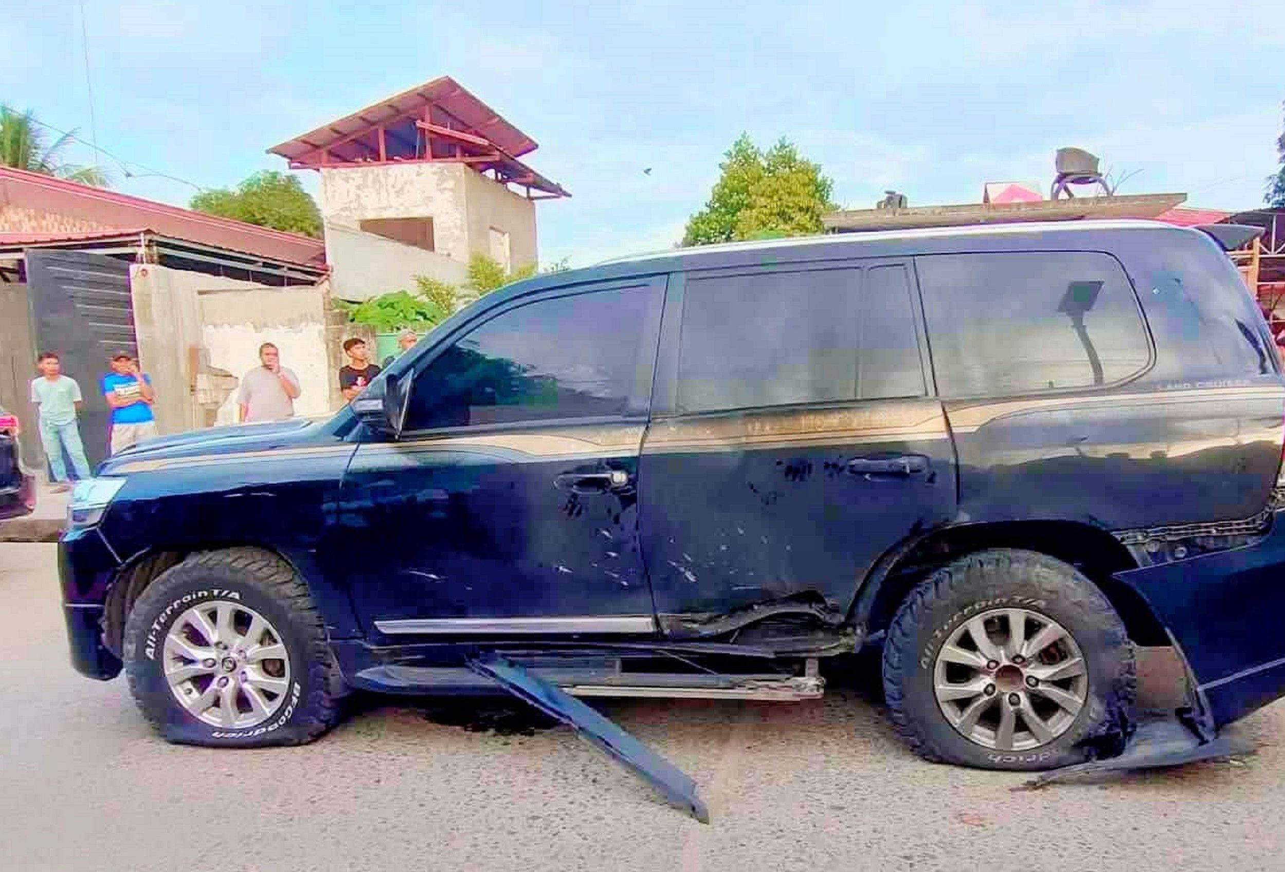 The sports utility vehicle of the mayor of Shariff Aguak town in Maguindanao del Sur, damaged by a B40 anti-tank rocket fired from a distance by men who ambushed their convoy in the municipality on Sunday morning, January 25, 2026. (Photo: philstar.com)