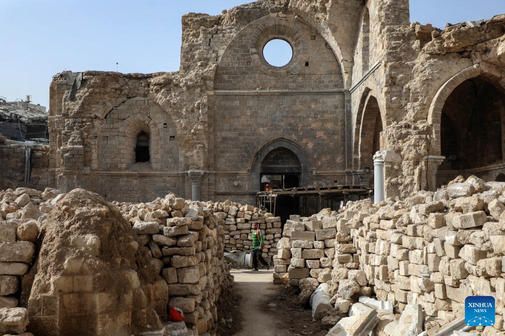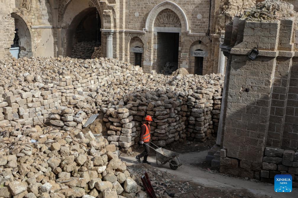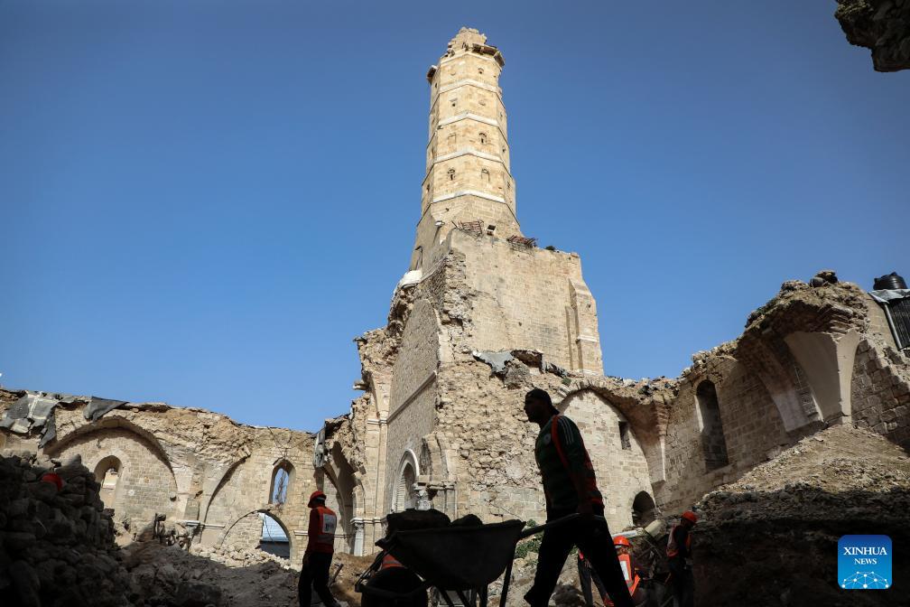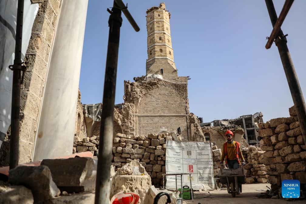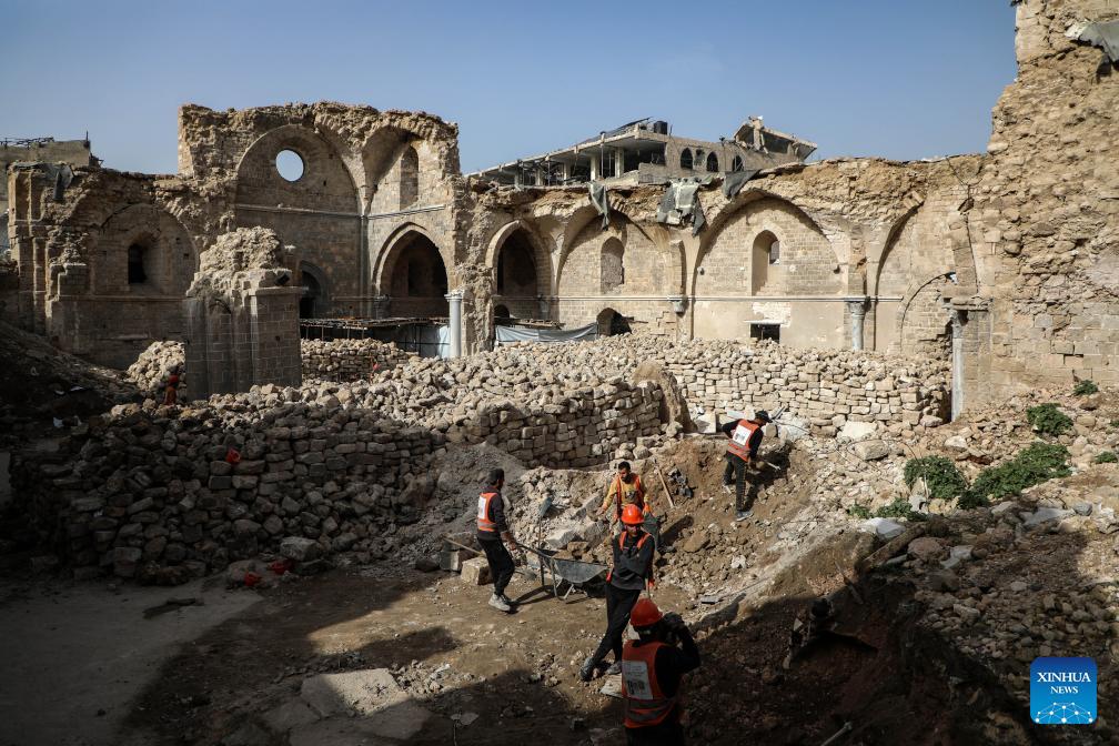 Constructors work at the restoration site of the Al-Omari Grand Mosque, one of Gaza's most important historical and religious landmarks, in Gaza City, on Jan. 24, 2026. (Photo by Rizek Abdeljawad/Xinhua)