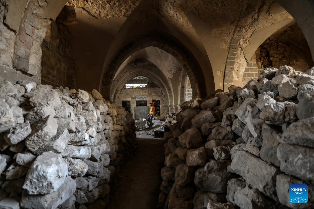 A constructor works at the restoration site of the Al-Omari Grand Mosque, one of Gaza's most important historical and religious landmarks, in Gaza City, on Jan. 24, 2026. (Photo by Rizek Abdeljawad/Xinhua)