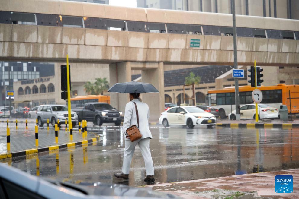 A man walks on a street during a rain in Kuwait City, Kuwait, on Jan. 25, 2026. Kuwait was hit on Sunday by sudden heavy rain, causing floods in parts of the country. (Photo by Asad/Xinhua)