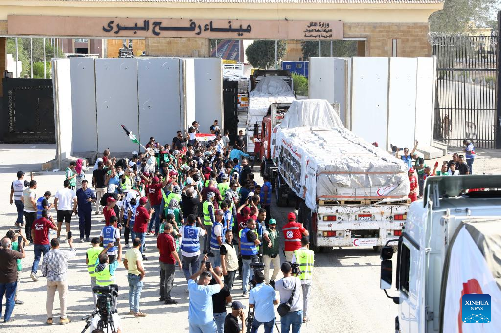 Trucks loaded with humanitarian aid enter Gaza at the Egyptian side of the Rafah border crossing with Gaza on October 21, 2023. (File photo: Xinhua)