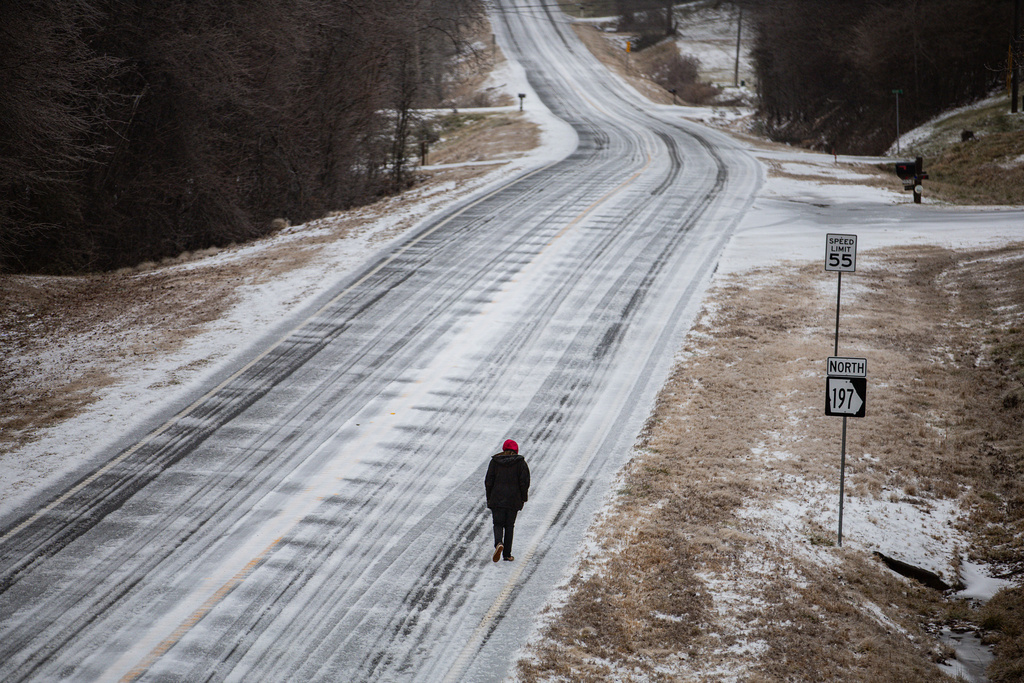 A lone individual walks along an empty highway glazed in ice by Winter Storm Fern in Habersham County, Georgia. (Photo provided to AP)