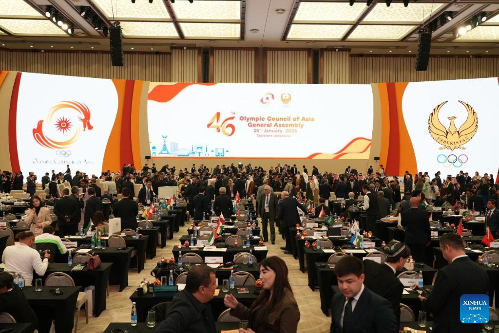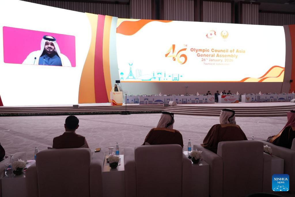This photo taken on Jan. 26, 2026 shows the 46th General Assembly of the Olympic Council of Asia (OCA) in Tashkent, Uzbekistan. (Photo by Zafar Khalilov/Xinhua)