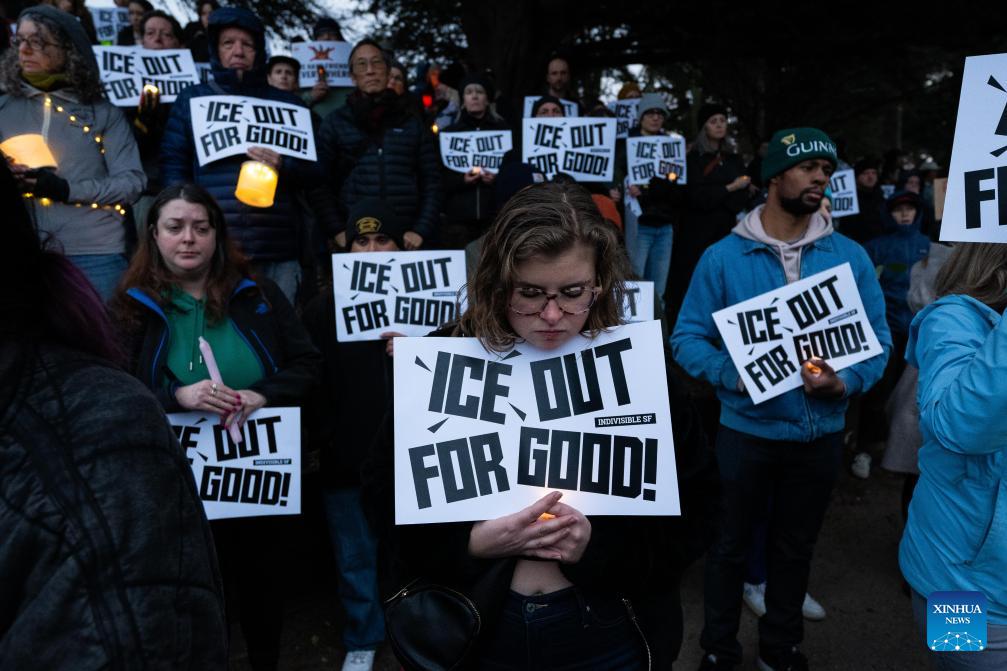 People attend a candlelight vigil held for Alex Pretti in San Francisco, California, the United States, on Jan. 25, 2026. A Minnesota resident was fatally shot by federal law enforcement agents on Saturday.