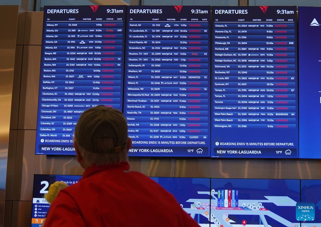 This photo taken on Jan. 25, 2026 shows a screen displaying flight information at LaGuardia Airport in New York, the United States. A historic winter storm is sweeping across the Midwest and eastern parts of the United States on Sunday, causing unprecedented travel chaos.
