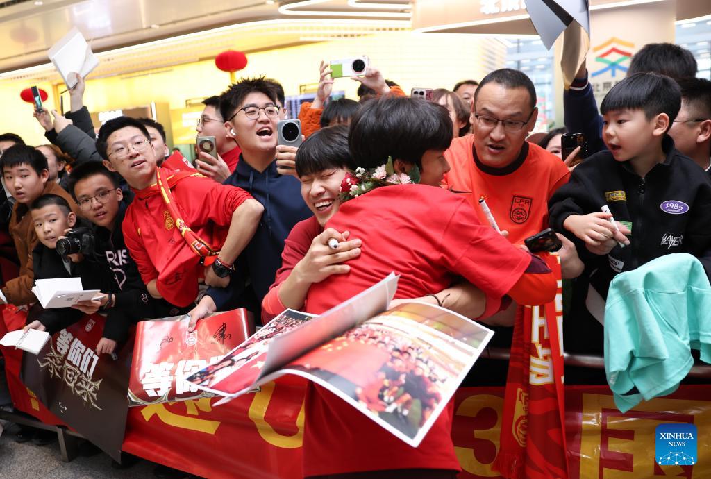 Kuai Jiwen (front) of Chinese U23 men's football team hugs fans at Beijing Daxing International Airport in Beijing, China, Jan. 26, 2026. Team China, which finished as runner-up at the AFC U23 Asian Cup in Saudi Arabia, arrived in Beijing on Monday. (Xinhua/Luo Yuan)