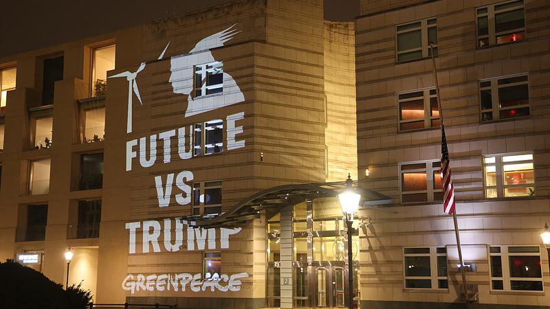 Greenpeace activists project an illumination showing a wind turbine and that reads: "Future vs. Trump" on the facade of the US Embassy to protest against the withdrawal of the United States by newly-inaugurated US President Donald Trump from the Paris Agreement in Berlin, Germany, on January 21, 2025. (Photo: VCG)