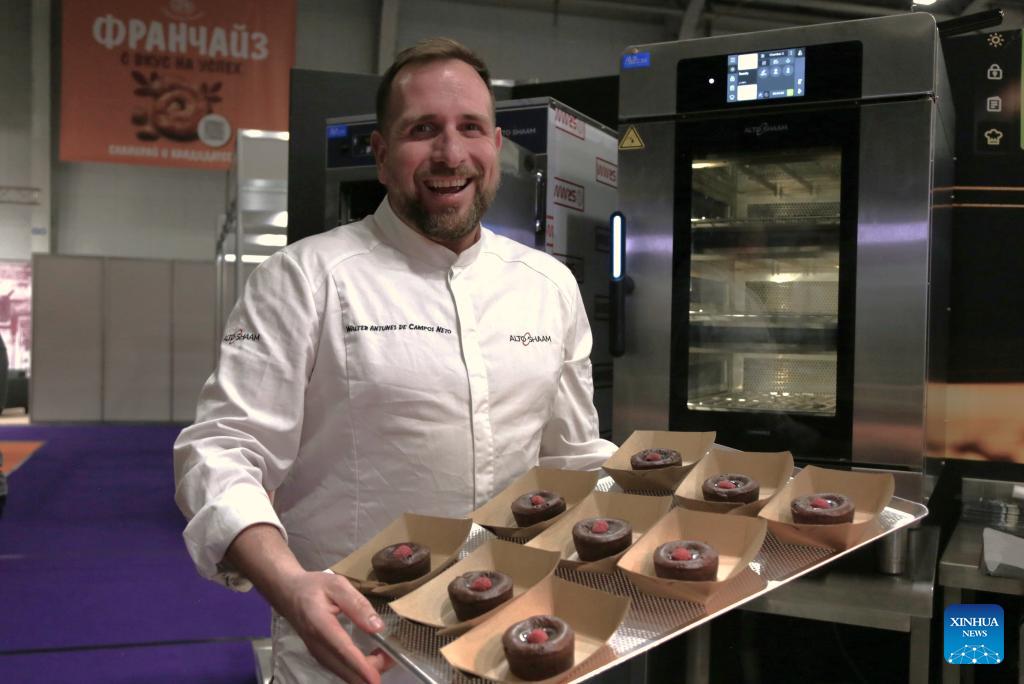 A chef displays baked chocolate cakes at the exhibition in Sofia, Bulgaria, Jan. 27, 2026. The 23rd edition of the international exhibition SIHRE kicked off in the Inter Expo Center here on Tuesday offering products and services for restaurants, hotels, and the catering industry. (Xinhua/Yao Yulin)