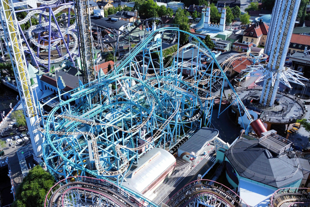 Aerial picture of rollercoaster Jetline at amusement park Gröna Lund in Stockholm, Sweden, Monday June 26, 2023. (File photo: TT News Agency via AP)
