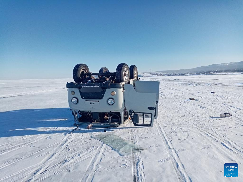 This photo taken on Jan. 28, 2026 shows an overturned car on the frozen surface of Lake Baikal in Russia. A Chinese tourist died after a car carrying tourists overturned on the frozen surface of Lake Baikal in Russia on Wednesday. (Photo: Xinhua)