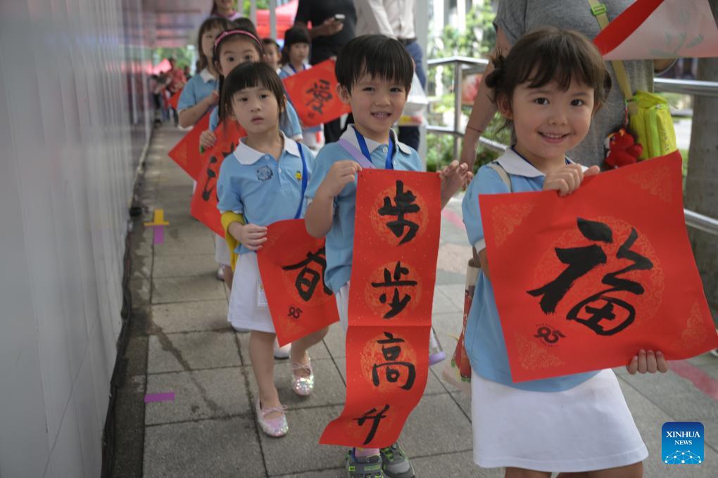 Children queue to receive gift calligraphy works as part of the celebrations for the upcoming Spring Festival, at Singapore's financial center on Jan. 29, 2026. (Photo by Then Chih Wey/Xinhua)