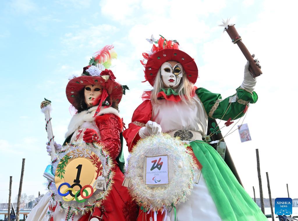 Revelers dressed in the theme of the 2026 Milano-Cortina Winter Olympic Games pose at St. Mark's Square during the Venice Carnival 2026 in Venice, Italy, Jan. 31, 2026. The 2026 version of the traditional Venice Carnival runs from Jan. 31 to Feb. 17. (Photo by Alberto Lingria/Xinhua)