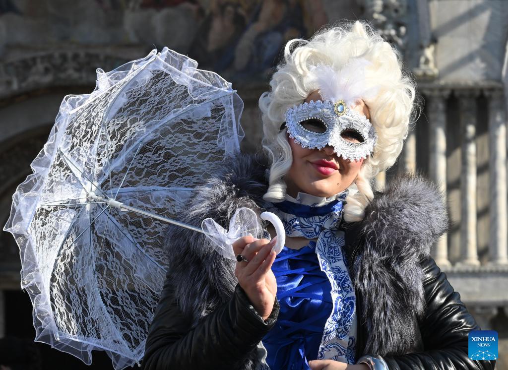 A reveler poses at St. Mark's Square during the Venice Carnival 2026 in Venice, Italy, Jan. 31, 2026. The 2026 version of the traditional Venice Carnival runs from Jan. 31 to Feb. 17. (Photo by Alberto Lingria/Xinhua)