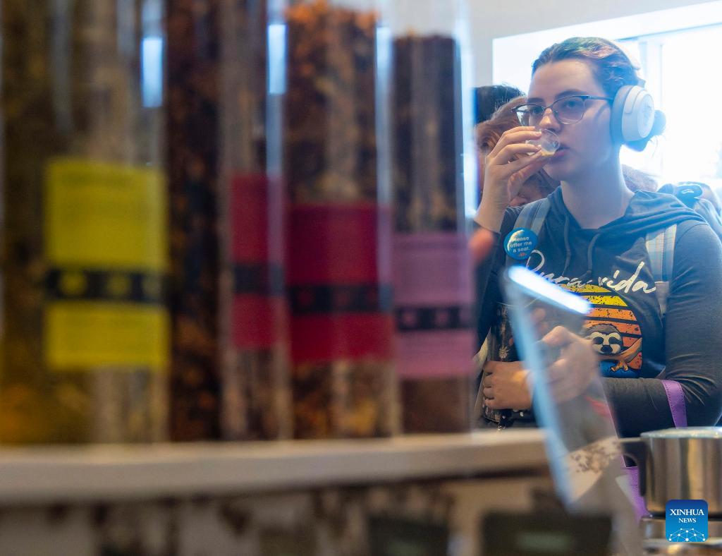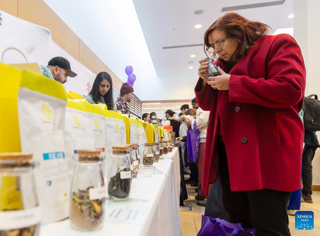 A woman smells tea samples during the 2026 Toronto Tea Festival in Toronto, Canada, on Jan. 31, 2026. As part of the "Happy Chinese New Year" activities in Toronto, the two-day event kicked off here on Saturday with the participation of some 50 exhibitors. (Photo by Zou Zheng/Xinhua)