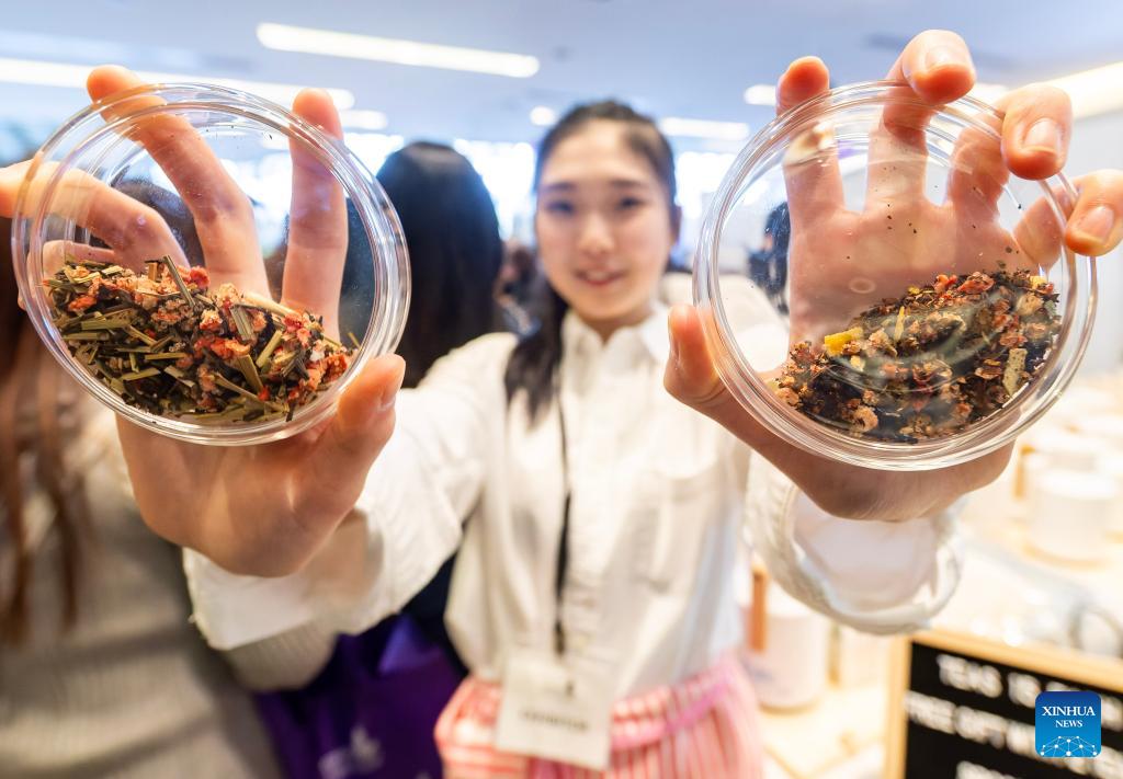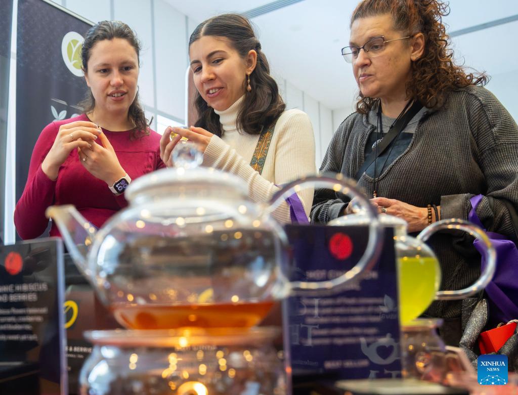 An exhibitor shows tea samples during the 2026 Toronto Tea Festival in Toronto, Canada, on Jan. 31, 2026. As part of the "Happy Chinese New Year" activities in Toronto, the two-day event kicked off here on Saturday with the participation of some 50 exhibitors. (Photo by Zou Zheng/Xinhua)