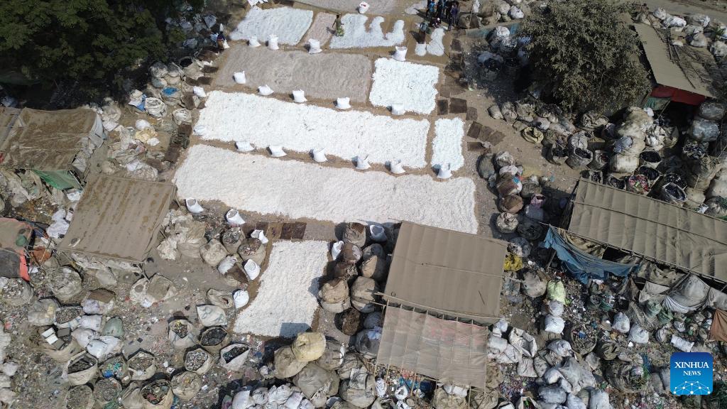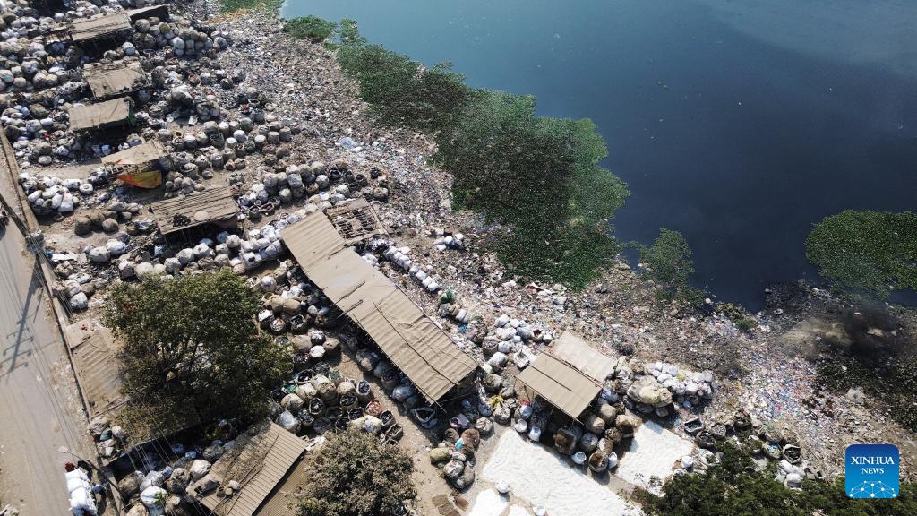 An aerial drone photo taken on Jan. 31, 2026 shows plastic waste being stacked and sorted along the banks of the Buriganga River in Dhaka, Bangladesh. (Photo by Habibur Rahman/Xinhua)