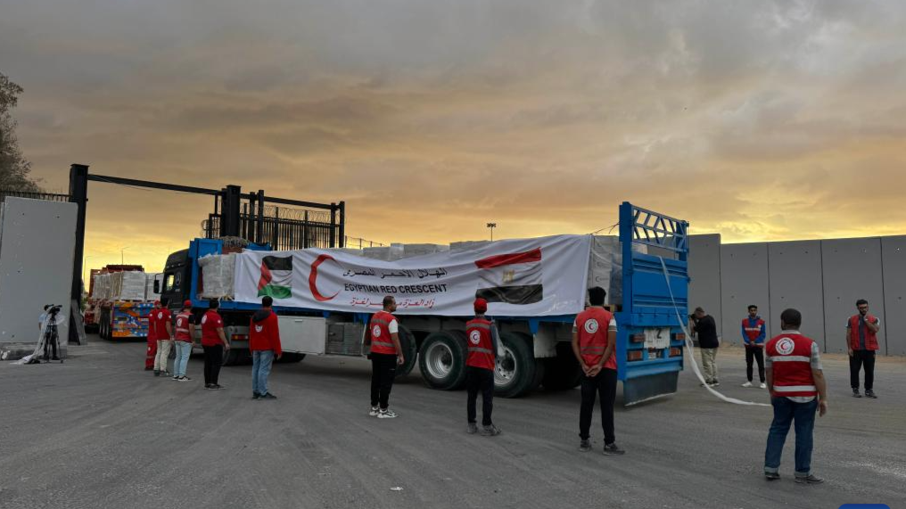 Staff members from Egyptian Red Crescent stand near a truck carrying humanitarian aid as it enters Gaza from the Egyptian side of the Rafah border crossing on Oct 12, 2025. (File photo: Xinhua)