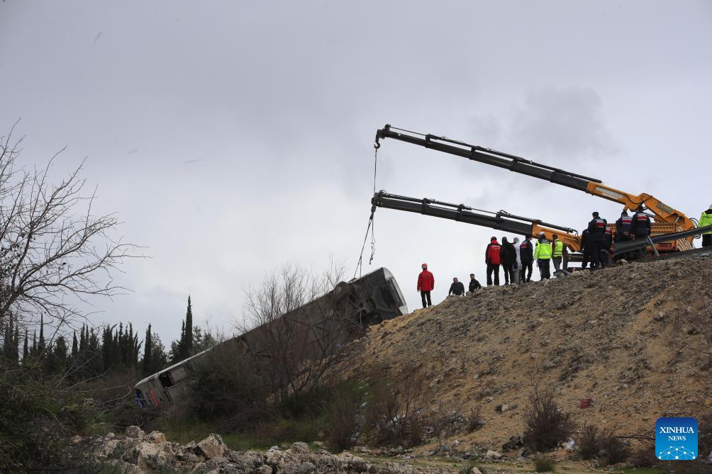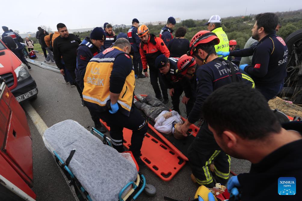 ANKARA, Feb. 1 (Xinhua) -- Eight people were killed and 26 others injured when a passenger bus travelling in southern Türkiye's Antalya province veered off the road and overturned into a ditch on Sunday, local broadcaster NTV reported.