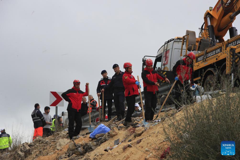 Rescuers work at the site of a bus crash in southern Türkiye's Antalya province, Feb. 1, 2026. Eight people were killed and 26 others injured when a passenger bus travelling in southern Türkiye's Antalya province veered off the road and overturned into a ditch on Sunday, local broadcaster NTV reported. (Mustafa Kaya/Handout via Xinhua)