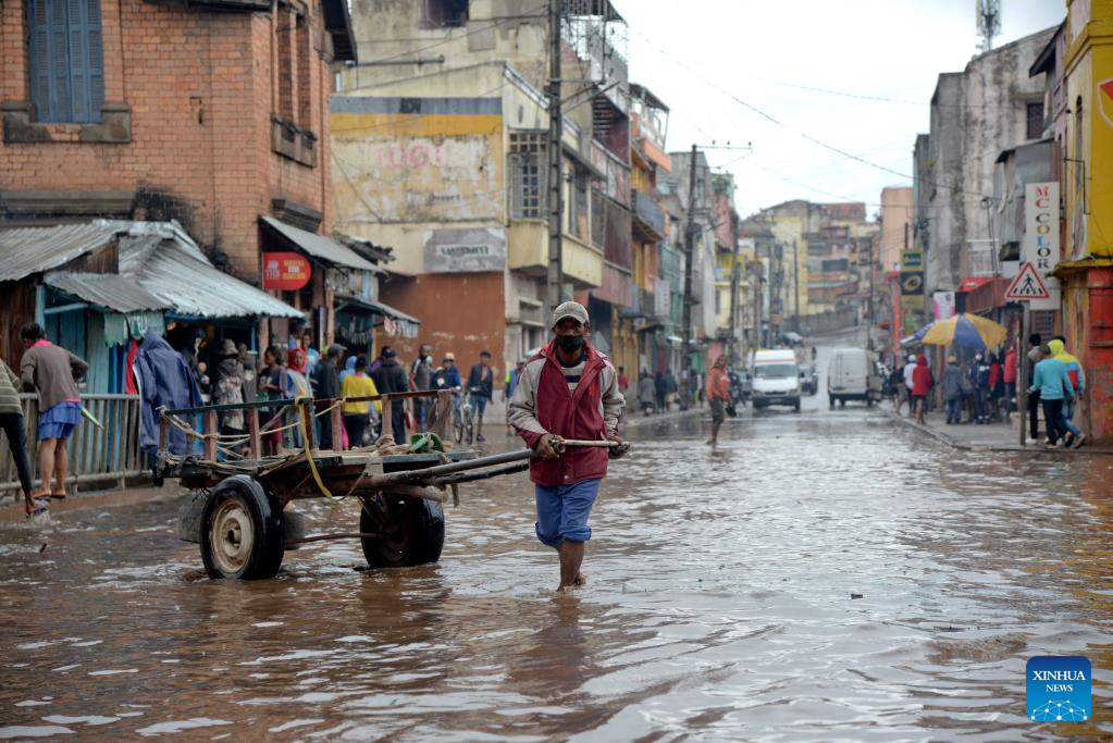 A man pulling a cart wades through a flooded road in Antananarivo, Madagascar, on February 6, 2022. (File photo: Xinhua)