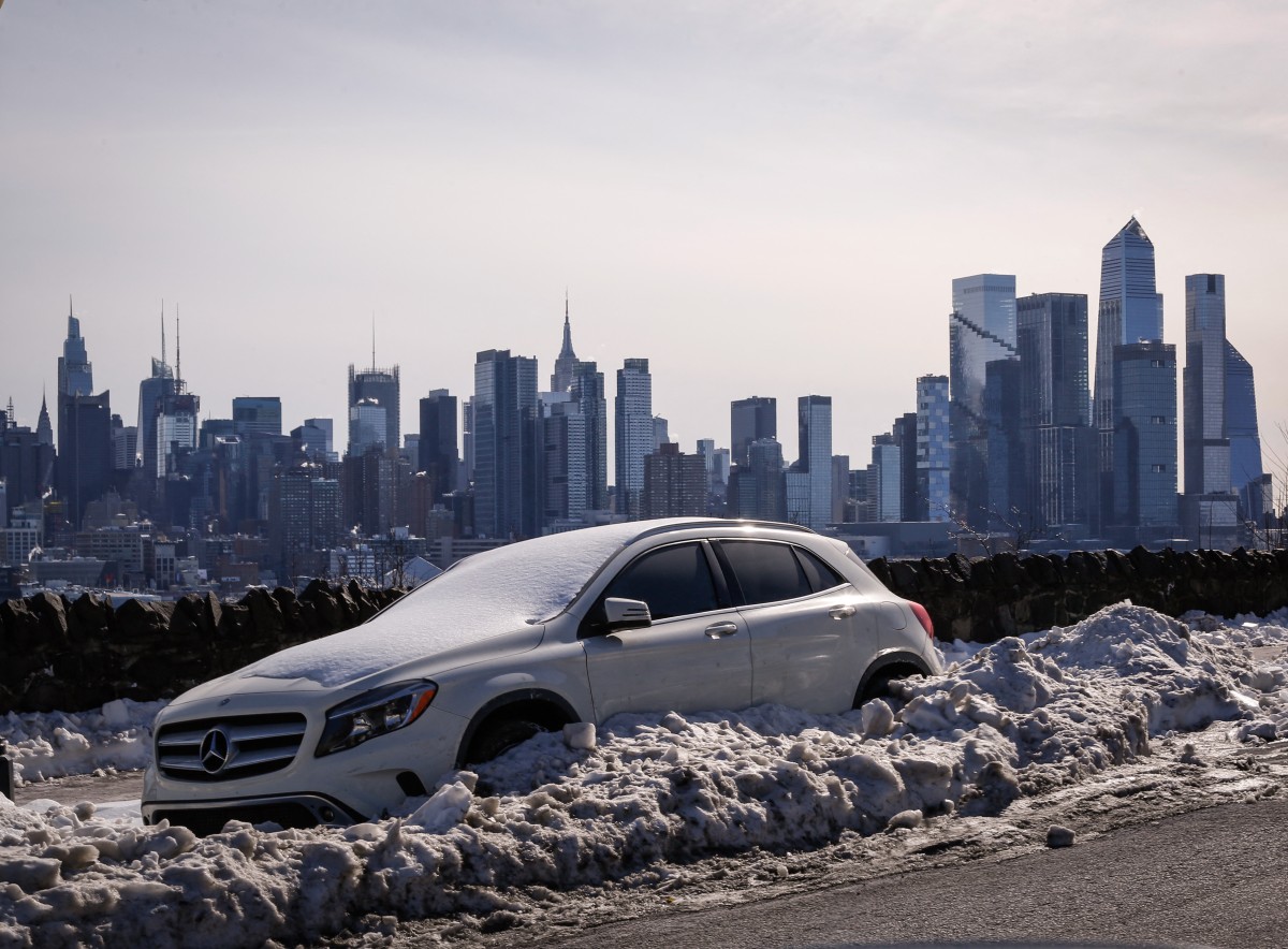 Snow covers a car and sidewalk as the New York skyline is seen in the background from Weehawken, New Jersey, on February 1, 2026. (Photo: AFP)