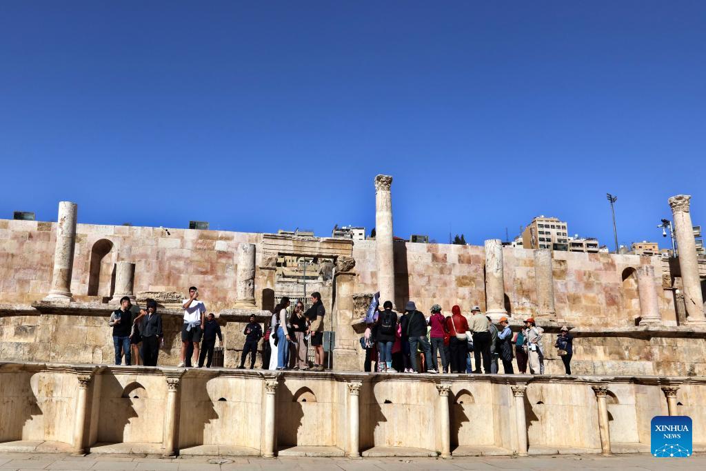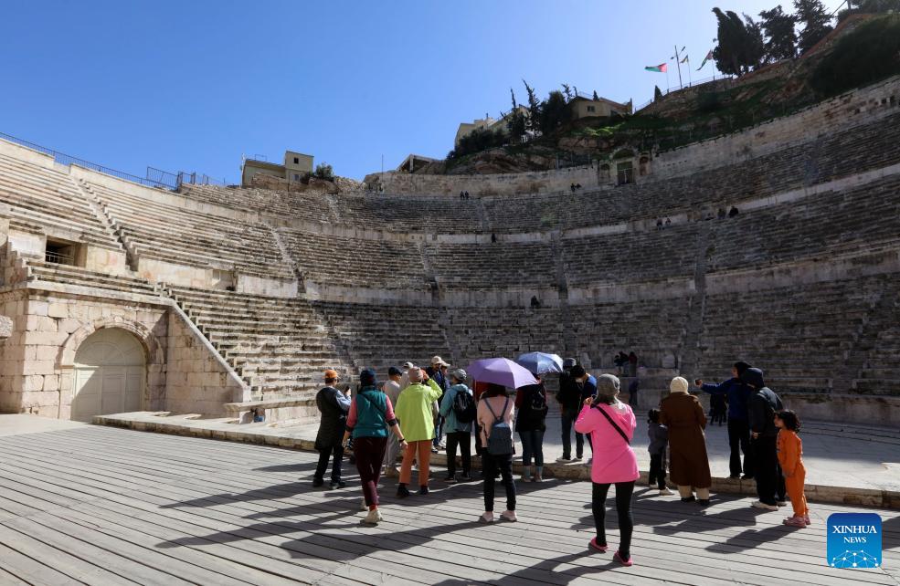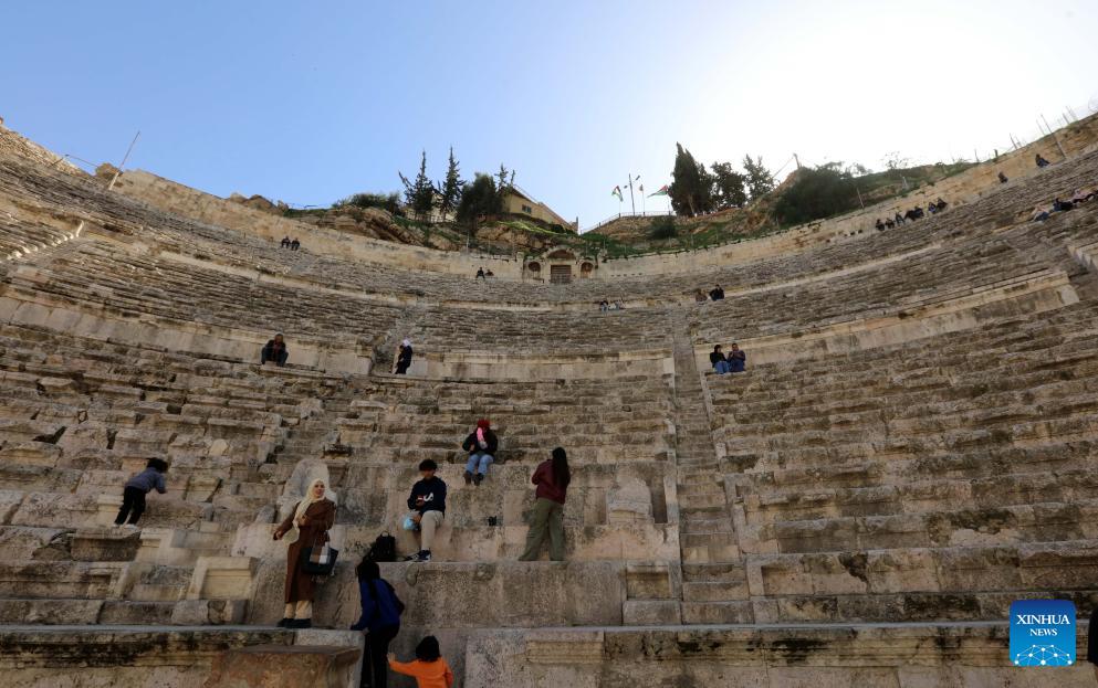 People visit the historical Roman Theater in Amman, Jordan, Feb. 2, 2026. (Photo by Mohammad Abu Ghosh/Xinhua)