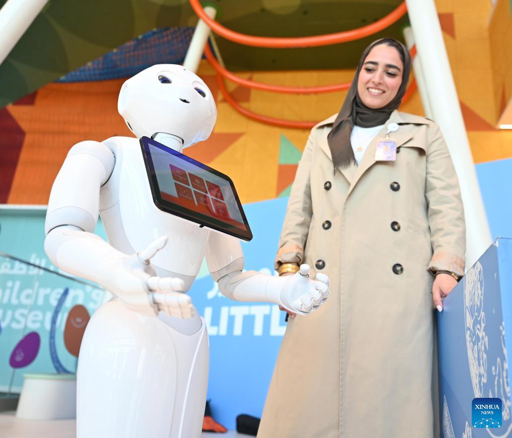A student stands next to a robot during the exhibition in Hawalli Governorate, Kuwait, Feb. 2, 2026. An one-day educational technology exhibition was held on Monday, highlighting Kuwait's commitment to advancing education by promoting innovation, digital transformation, and the effective integration of technology into teaching and learning. (Photo by Asad/Xinhua)