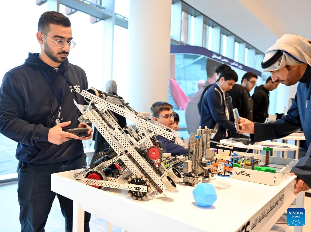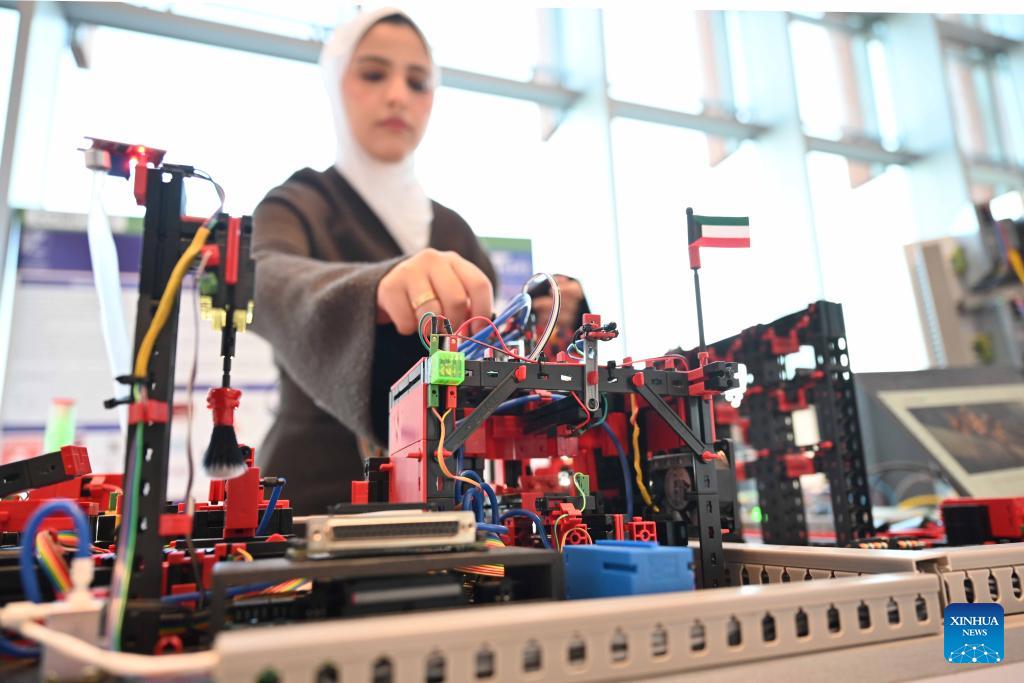 Students showcase their invention during the exhibition in Hawalli Governorate, Kuwait, Feb. 2, 2026. An one-day educational technology exhibition was held on Monday, highlighting Kuwait's commitment to advancing education by promoting innovation, digital transformation, and the effective integration of technology into teaching and learning. (Photo by Asad/Xinhua)
