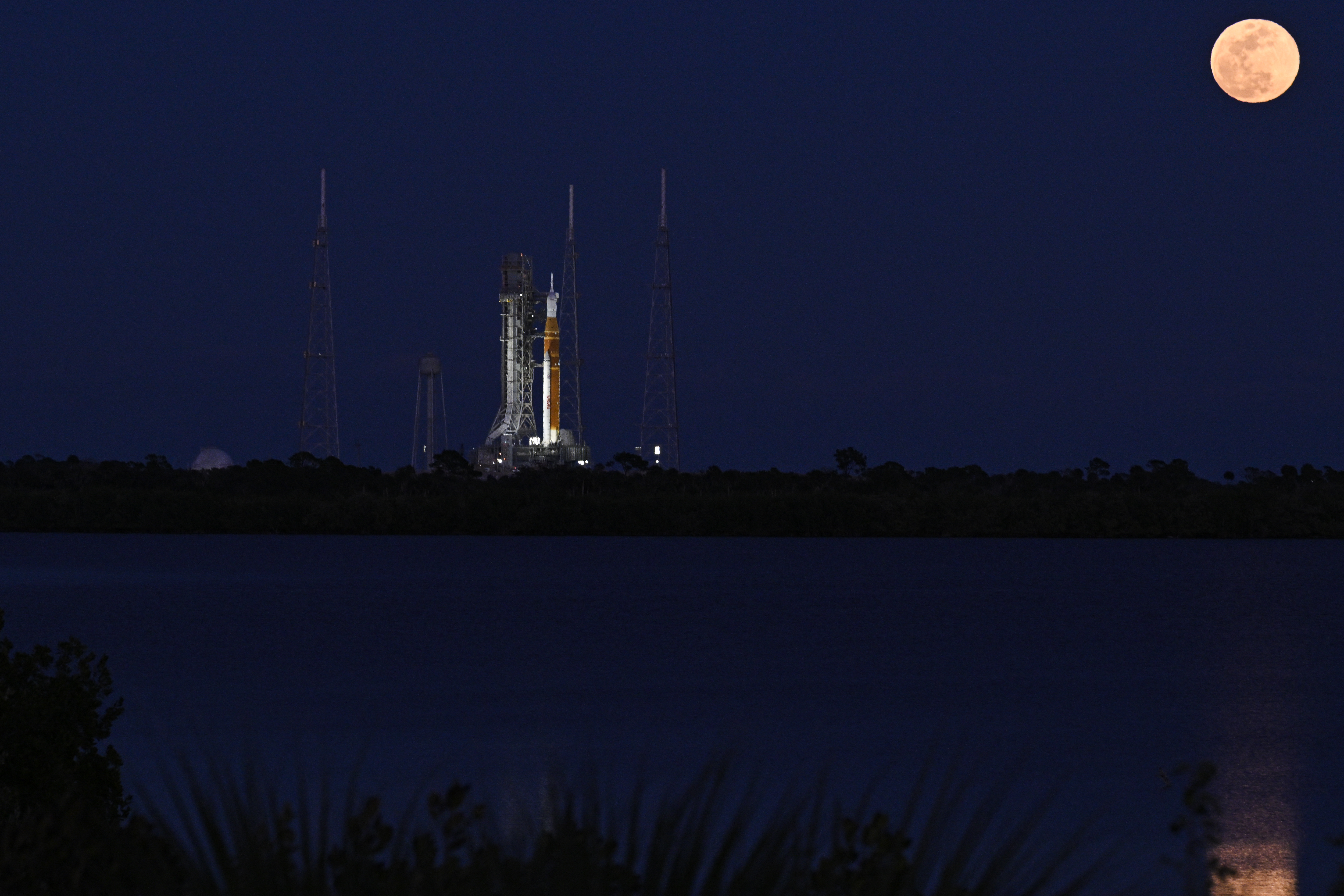 The Space Launch System (SLS) rocket and the Orion spacecraft, integrated for the Artemis II mission, are seen as a full moon rises over the Launch Pad 39B at the Kennedy Space Center in Cape Canaveral, Florida, on February 1, 2026 ahead of the first crewed mission to the Moon in more than 50 years. (Photo by Miguel J. Rodriguez Carrillo / AFP)