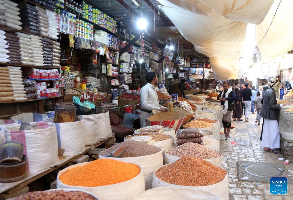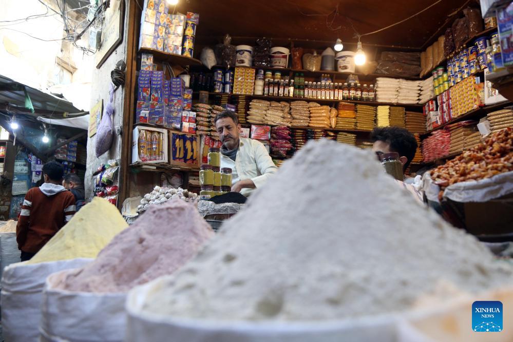 Photo taken on Feb. 3, 2026 shows a shop at a market in the UNESCO-listed Old City of Sanaa, Yemen. Yemen's UNESCO-listed Old City of Sanaa is home to over 6,000 unique multi-story mud-brick structures dating back 2,500 years. (Photo by Mohammed Mohammed/Xinhua)