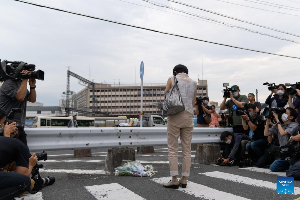 A citizen mourns at the site where late former Japanese Prime Minister Shinzo Abe was shot in Nara, Japan, July 8, 2022. (File photo: Xinhua)