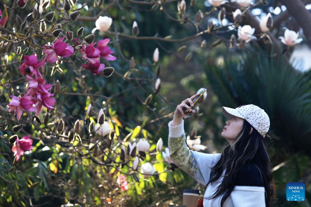 A visitor takes photos of Magnolia blossoms in San Francisco, the United States, Feb. 3, 2026. (Photo by Liu Yilin/Xinhua)