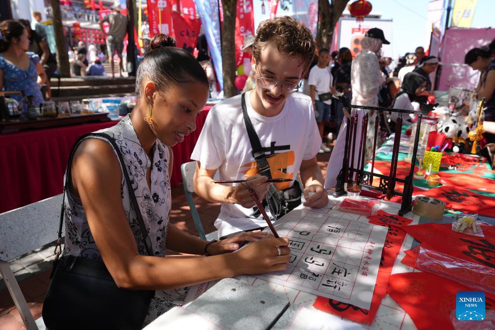 People learn to write Chinese calligraphy during an event in celebration of the Chinese New Year in Cape Town, South Africa, on Feb. 1, 2026. The bustling Victoria & Alfred Waterfront in Cape Town, South Africa's legislative capital, came alive with vibrant colors and lively performances on Sunday as the upcoming Chinese New Year was celebrated. The event attracted hundreds of local residents and foreign tourists, injecting fresh momentum into people-to-people exchanges between China and Africa. (Xinhua/Wang Lei)