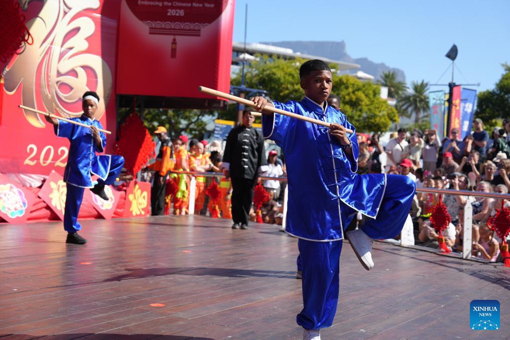 People perform Chinese martial arts during an event in celebration of the Chinese New Year in Cape Town, South Africa, on Feb. 1, 2026. The bustling Victoria & Alfred Waterfront in Cape Town, South Africa's legislative capital, came alive with vibrant colors and lively performances on Sunday as the upcoming Chinese New Year was celebrated.
