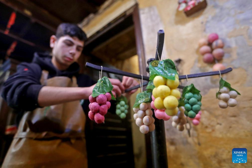 A man hangs bunches of grapes crafted from soap at the Soap Museum in Tripoli, northern Lebanon, Feb. 5, 2026. (Photo by Bilal Jawich/Xinhua)