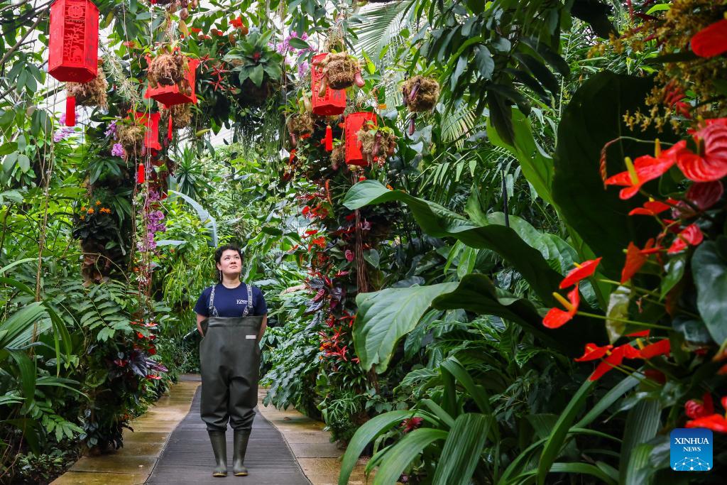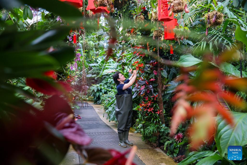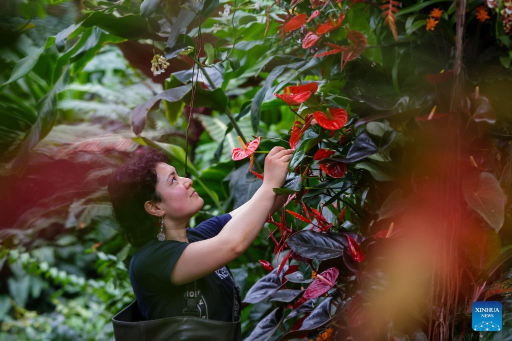 A member of staff puts the finishing touches to floral displays of orchids ahead of the Orchid Festival at Kew Gardens in London, Britain, Feb. 5, 2026. The festival will open to the public from Feb. 7 to March 8. (Xinhua)