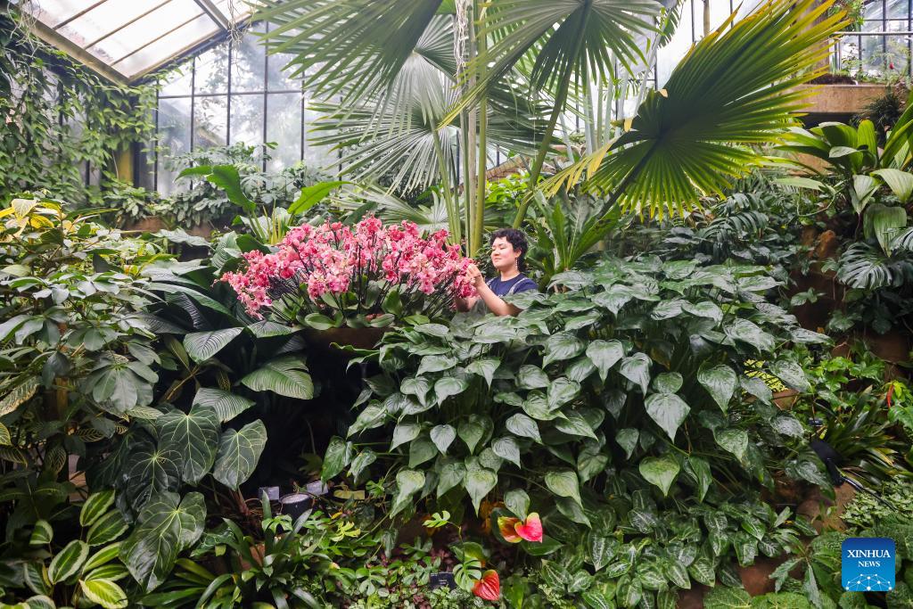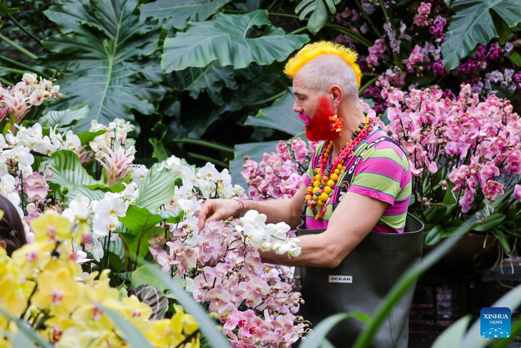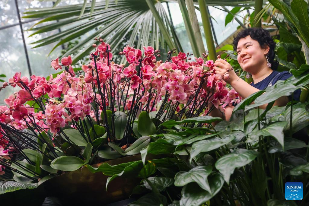 A member of staff poses with a display of orchids ahead of the Orchid Festival at Kew Gardens in London, Britain, Feb. 5, 2026. The festival will open to the public from Feb. 7 to March 8. (Xinhua)