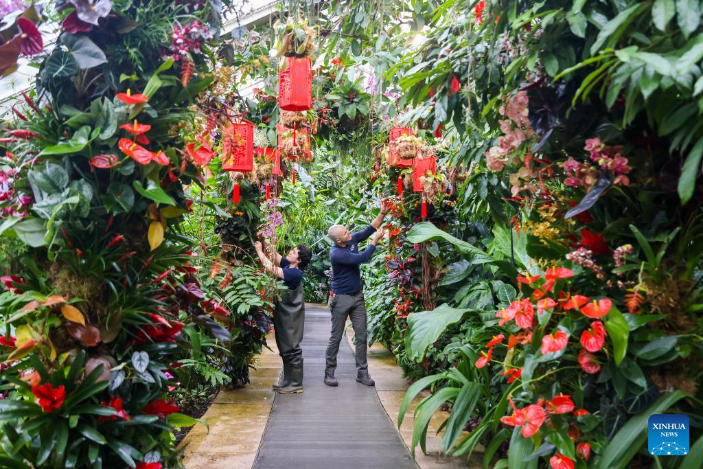 Members of staff put the finishing touches to floral displays of orchids ahead of the Orchid Festival at Kew Gardens in London, Britain, Feb. 5, 2026. The festival will open to the public from Feb. 7 to March 8. (Xinhua)