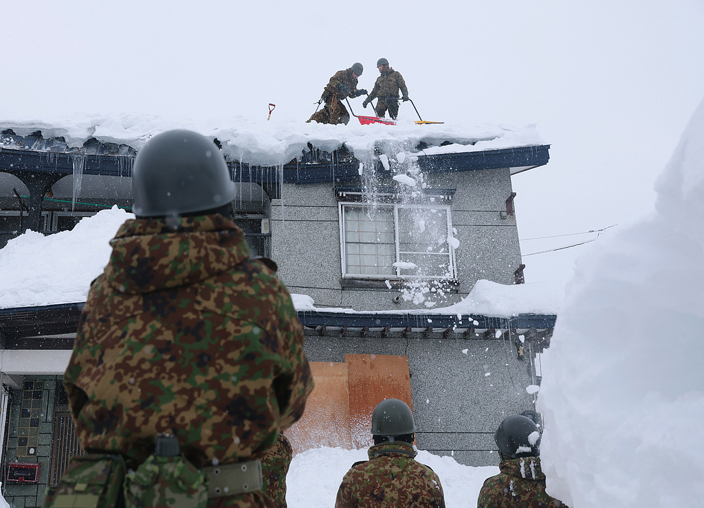 Members of the Japan Ground Self-Defense Force clear snow from a house's roof in Aomori City, Aomori Prefecture, Japan, on February 3, 2026. /CFP