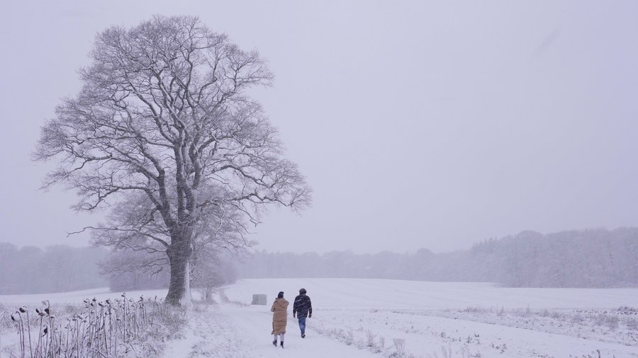 People walk in the snow in Humlebaek, Denmark, Jan. 6, 2021. Denmark sees the first snow of 2021 across the country on Jan. 6. (File photo: Xinhua)