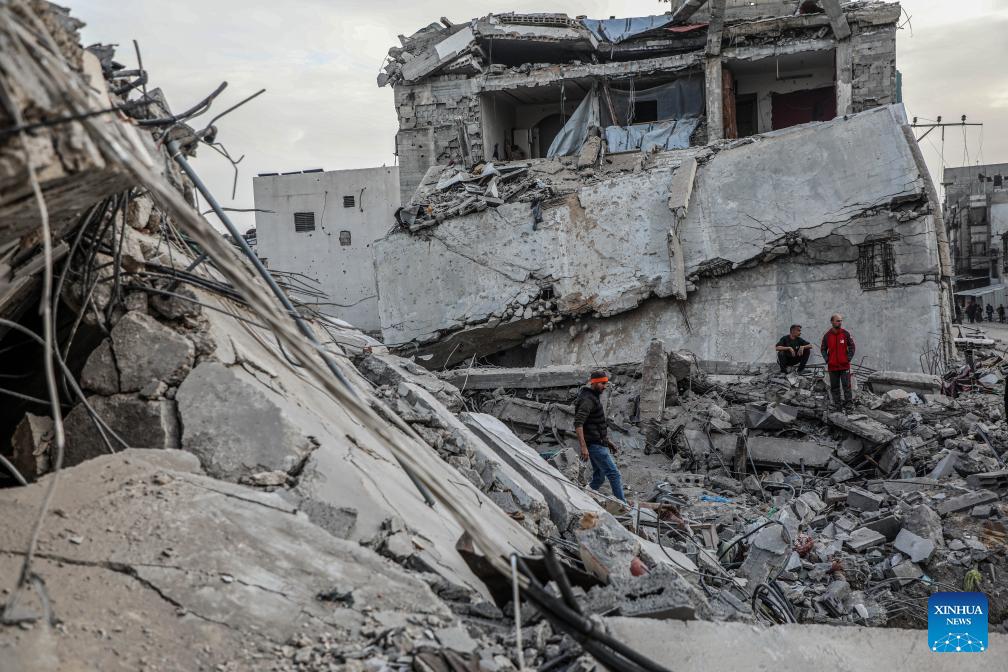 Palestinians inspect the damage after an Israeli airstrike that destroyed a three-story building in the Zeitoun neighborhood, southeast of Gaza City, on Feb. 6, 2026. (Photo by Rizek Abdeljawad/Xinhua)