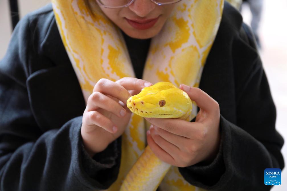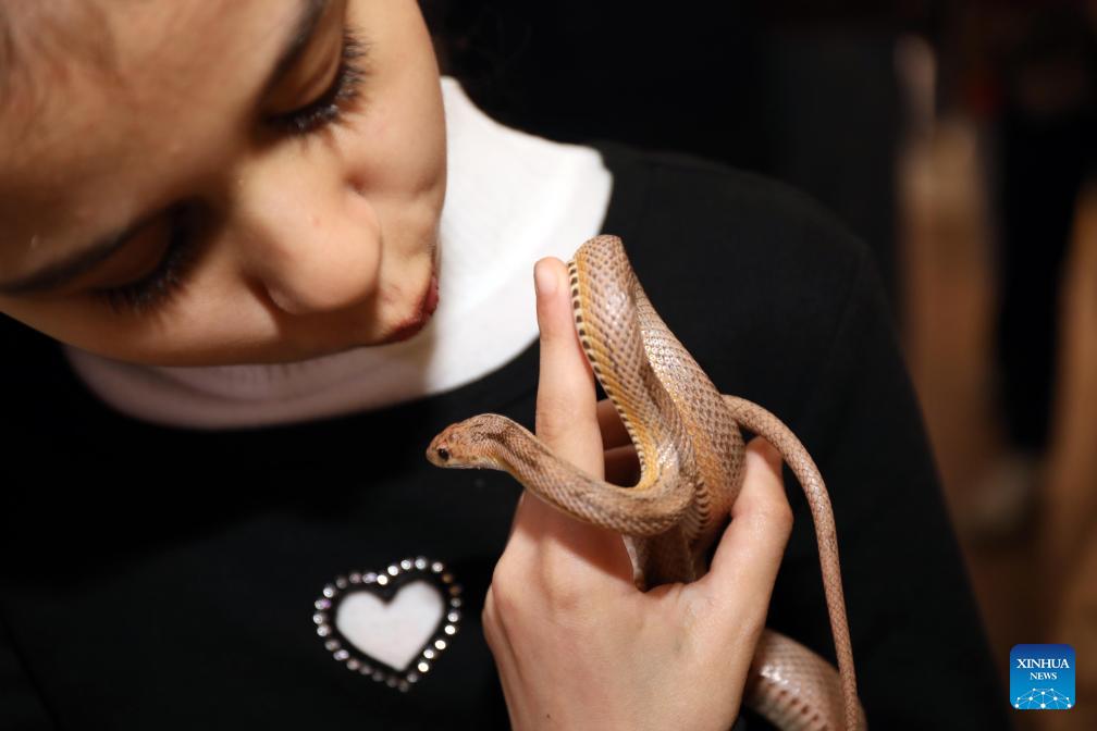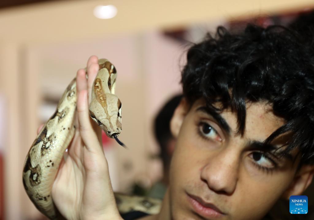 A reptile lover displays a snake at a reptile fair held in Baghdad, Iraq, on Feb. 6, 2026. (Xinhua/Khalil Dawood)
