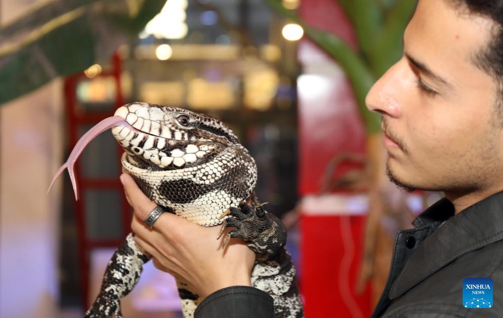 A reptile lover displays a lizard at a reptile fair held in Baghdad, Iraq, on Feb. 6, 2026. (Xinhua/Khalil Dawood)