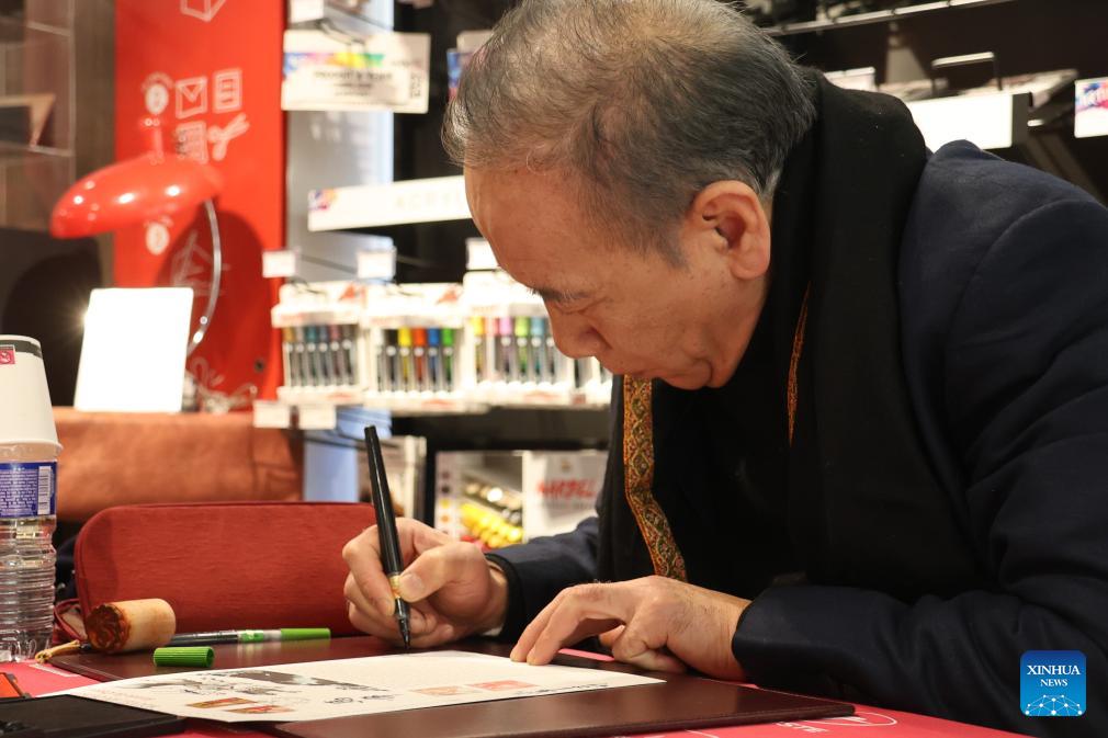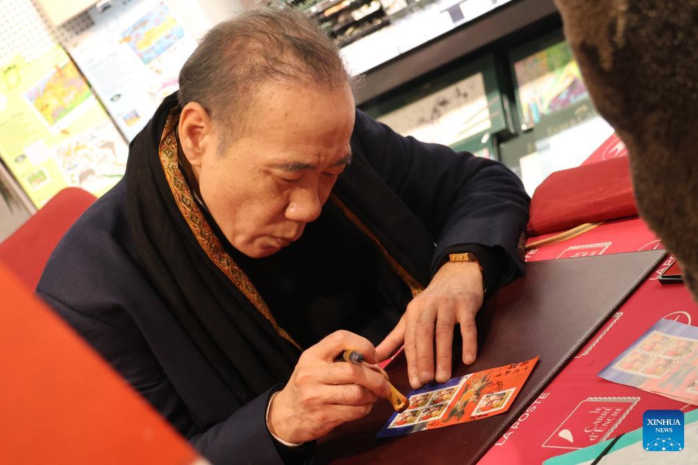 Chen Jianghong, an artist of Chinese origin, also the designer of the stamps, signs on the Year of the Horse commemorative stamps during a launching ceremony in Paris, France, Feb. 6, 2026. France's La Poste Group on Friday issued two stamps to celebrate the upcoming Chinese Lunar New Year, the Year of the Horse. (Xinhua/Zhang Baihui)