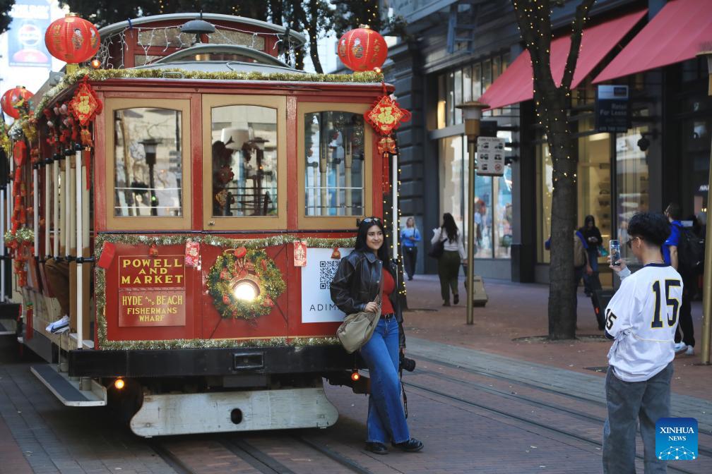 A sightseeing cable car decorated to celebrate the upcoming Chinese New Year is seen in San Francisco, the United States, Feb. 6, 2026. (Photo by Liu Yilin/Xinhua)