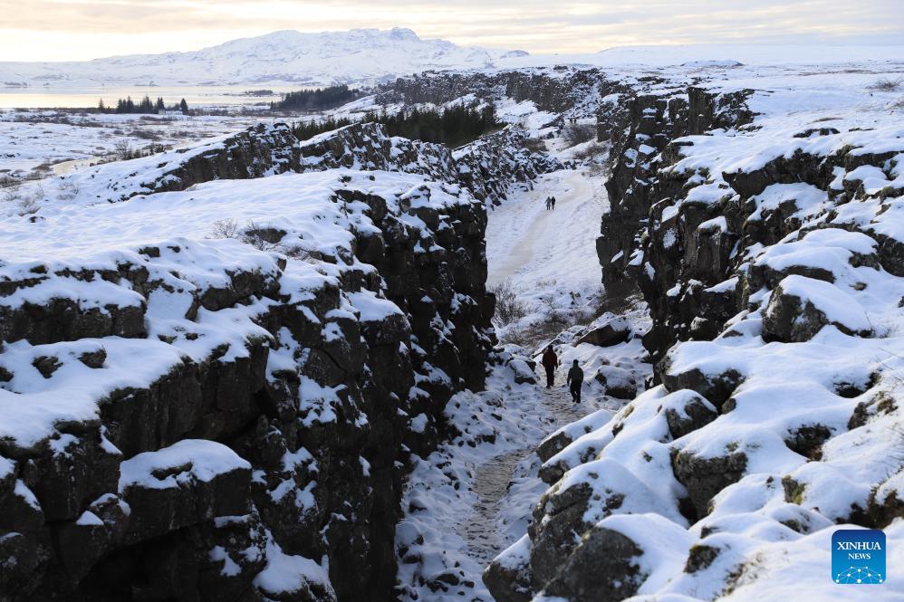 Tourists walk among rocky cliffs at Thingvellir National Park on Iceland on Feb. 7, 2026. (Xinhua/Zhu Haochen)